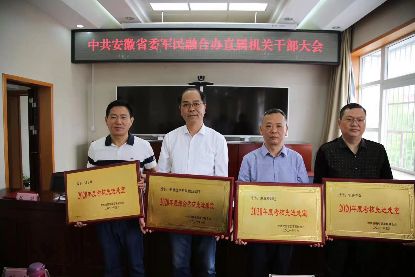 本网讯 近日,在中共安徽省委军民融合办直属机关干部大会上,beat365被省委军民融合办授予 “2020年度综合考核先进单位”荣誉称号,学校校长李麟书参加了授牌仪式。这是学校在省发改委、省委军民融合办的正确领导下,在省教育厅及六安市委市政府大力支持下,全校上下凝心聚力、奋力拼搏的成果。