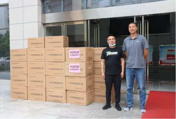 优秀校友马竞成(左)为母校捐赠6万只口罩。