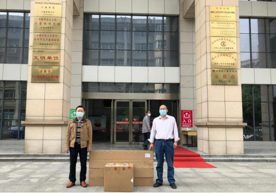 优秀校友王勇(左二)为学校捐赠口罩2万个、洗手液200瓶。