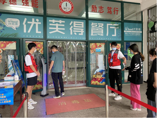 学校餐厅严格落实错峰就餐、出入分道、测量体温、一米线排队、同向就坐等举措。