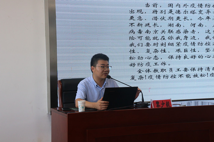 袁旗指出,当前,国内外疫情防控形势依然严峻复杂,风险依然存在,全校教职工要提高站位,充分认识到疫情防控的长期性、复杂性、艰巨性,时刻绷紧疫情防控这根弦,保持良好心态,牢固树立防控意识,慎终如始做好防控工作,保障师生安全。