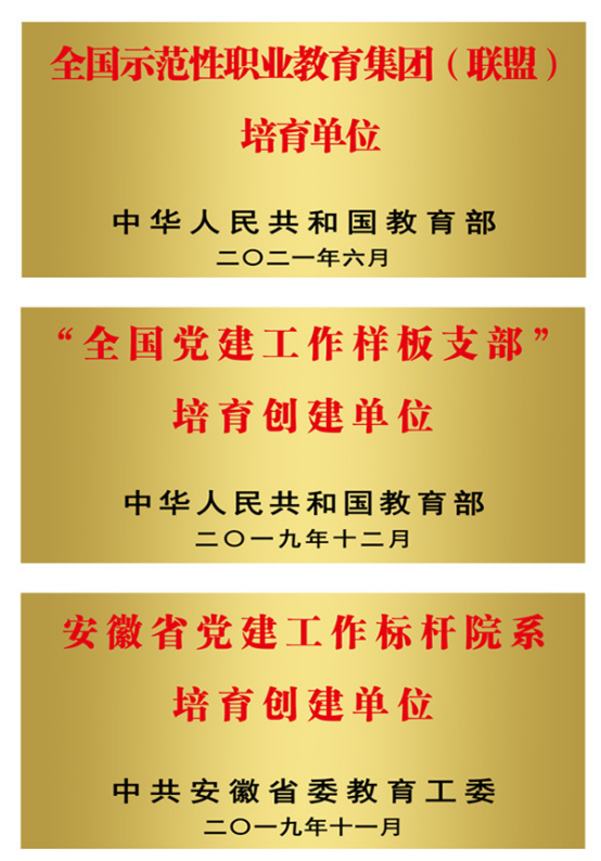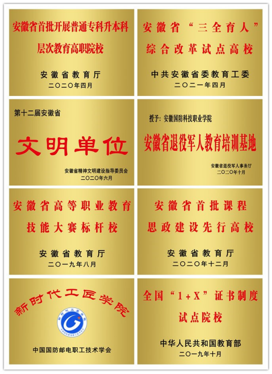五年来,学校全面加强党建工作和综合改革,持续推进创新发展和内涵建设,在办学水平、管理水平、服务水平、保障水平等方面取得显著成就,获得一个个沉甸甸的荣誉和表彰。五年来。学校已建成全国高职创新人才暨学科竞赛百强院校、国家国防教育特色学校、教育部现代学徒制试点学校、安徽省普通高校线上教学示范高校、全国高校首家新时代工匠学院、全国高校党建“样板支部”建设院校、安徽省“三全育人”综合改革试点高校、安徽省首批校企合作示范典型学校、安徽省军工保密教育培训基地、安徽省技能竞赛标杆院校、安徽省课程思政建设先行高校、安徽省文明单位、安徽省高校就业工作标兵单位、安徽省退役军人教育培训基地等。