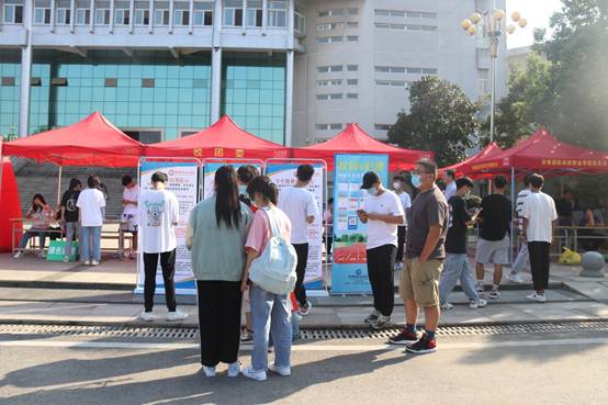 校园内的“红马甲”志愿者,为新生和家长答疑解惑、提供服务