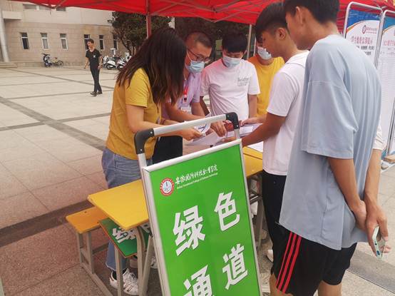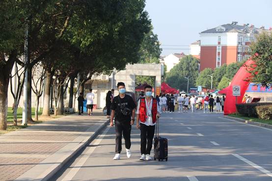 新生同学在现场标示指引下通过入校通道,依次接受返校码、安康码、行程卡和核酸检测报告核验等流程后,有序进入校园,在各院系迎新报到点办理报到手续,领取防疫爱心包和入学资料等物品。