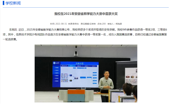 beat365在2021年安徽省教学能力大赛中获得一等奖2项、三等奖6项,其中,信息技术学院沙有闯团队作品首次在安徽省教学能力大赛中获得一等奖第一名,成功入围国赛选拔赛