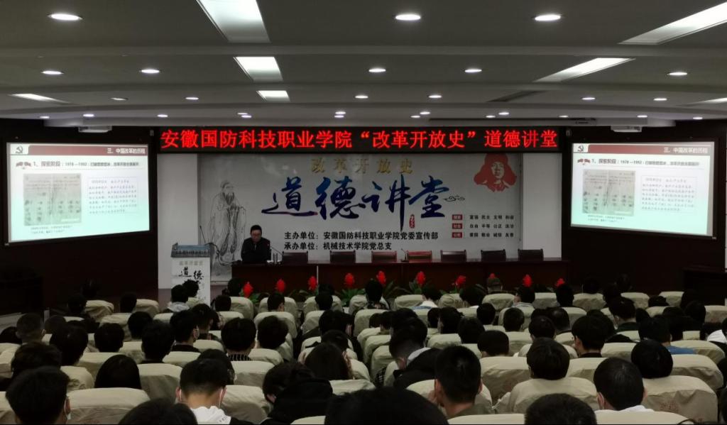 本网讯 为深入学习贯彻习近平新时代中国特色社会主义思想及党的十九大和十九届二中、三中、四中、五中全会精神,积极培育和践行社会主义核心价值观,全面加强师生思想道德建设,大力弘扬中华民族优秀传统文化,2021年10月20日,由校党委宣传部主办、机械技术学院党总支承办的以“改革开放史”为主题的道德讲堂活动在校图书馆报告厅隆重举行,活动邀请安徽省委宣传部舆情信息处四级调研员单兆伟同志作专题讲座,全校200余名师生代表参加了此次活动,党委副书记冯伦久应邀出席活动,活动由机械技术学院团总支书记袁帅主持。