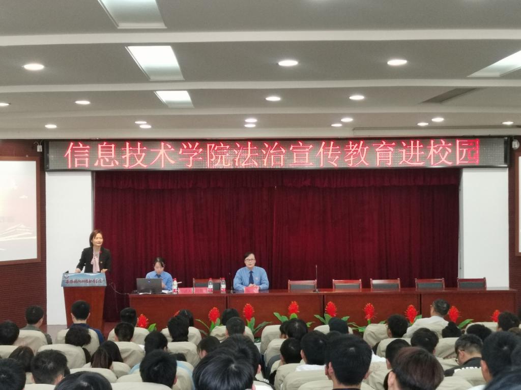 本网讯(信息技术学院 张婉蓉)为进一步弘扬法治精神,提高学生的法律意识、维权意识、自我防范意识,引导同学们争做知法、懂法、守法、护法的新时代好青年,10月27日下午,beat365信息技术学院在图书馆报告厅举办了“法治宣传教育进校园”主题讲座。
