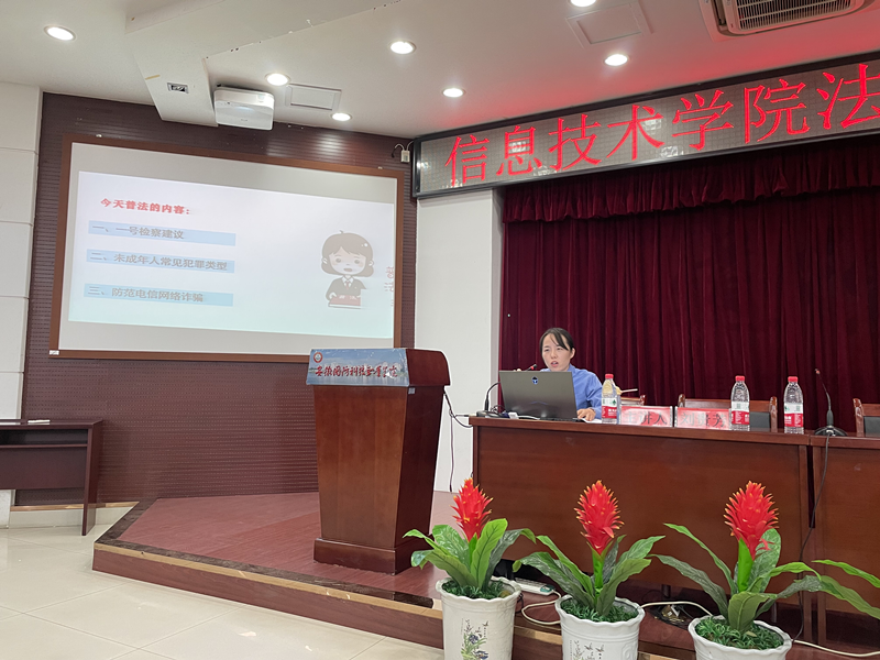 此次讲座邀请到了六安市金安区人民检察院阮兰检察官和刘贵芳检察官,并由刘贵芳检察官进行普法主讲,信息技术学院全体班主任和各级学生代表参加了此次讲座,讲座由信息技术学院党总支副书记杨庆颖主持。