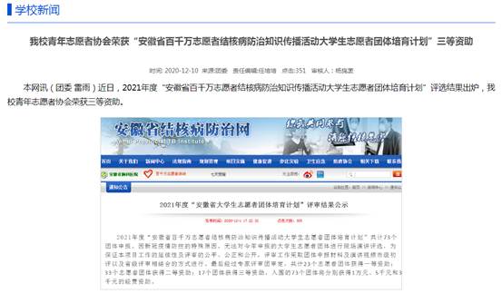beat365青年志愿者协会荣获2021年度“安徽省百千万志愿者结核病防治知识传播活动大学生志愿者团体培育计划”三等资助