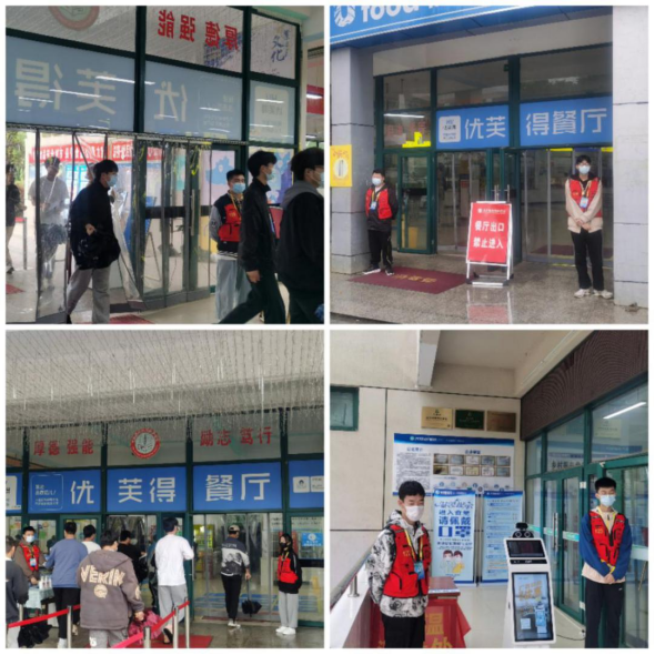 在核酸检测现场,团员青年突击队员们提醒同学们保持一米线距离,佩戴好口罩,引导大家安全有序检测;在食堂,团员青年突击队员轻声提醒同学们注意佩戴口罩、有序就餐、排队时注意间距,有的穿梭在桌椅间,收拾餐盘、清理桌面、接过食堂阿姨手中的餐盘推车;超市内外,团员青年突击队员们和后勤员工一起搬运、消杀、整理各类保障物,为同学们的正常生活提供有力保障;在学校的各个角落,团员青年突击队员们不辞艰辛地在定点值班或巡查,引导同学们活动做到不聚集、讲秩序,传播防护知识,对疑似翻越围墙的不良行为进行监督和劝阻,积极拍摄抗疫短视频,记录校园温暖瞬间。
