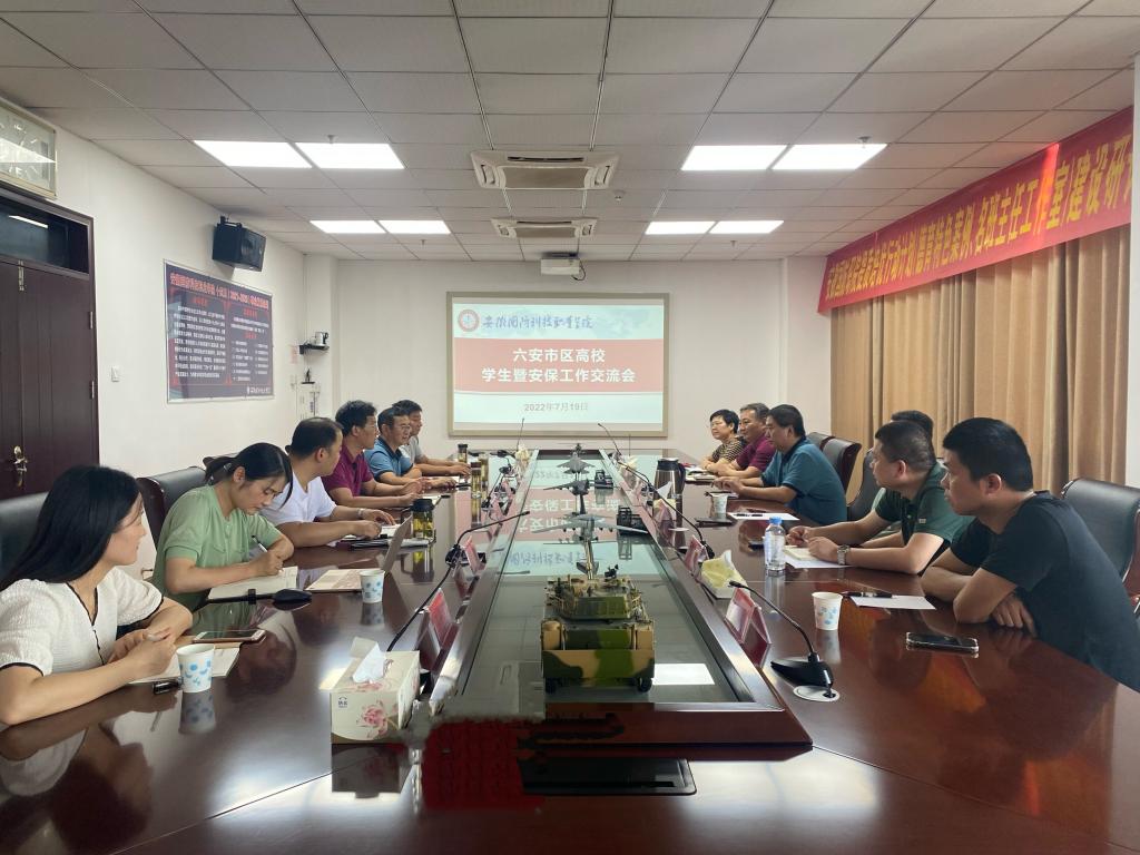 本网讯(学生处 孙洋洋)7月19日下午,beat365邀请六安市区各高校来校开展六安市区高校学生暨安保工作交流会。会议由校党委委员、副校长袁旗主持。皖西学院学生处处长凌明亮、保卫处处长何育华,六安职业技术学院保卫处处长司守勤、学生处副处长张品,皖西卫生职业学院学生处处长张磊、保卫处储刚等应邀参加交流会。学校学生处(安全保卫处)负责人,信息技术学院负责人、学工人员代表等参加了会议。