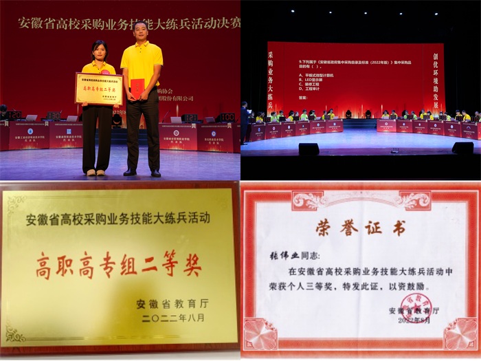 本网讯(总务处 黄伟伟)8月28日,由安徽省教育厅主办,安徽艺术学院和安徽省招标采购协会承办的“安徽省高校采购业务技能大练兵活动”决赛在合肥圆满落幕。由国资办张伟业老师和黄伟伟老师组建的参赛队伍,经过激烈角逐,获得高职高专组集体二等奖,张伟业同志荣获个人赛三等奖。