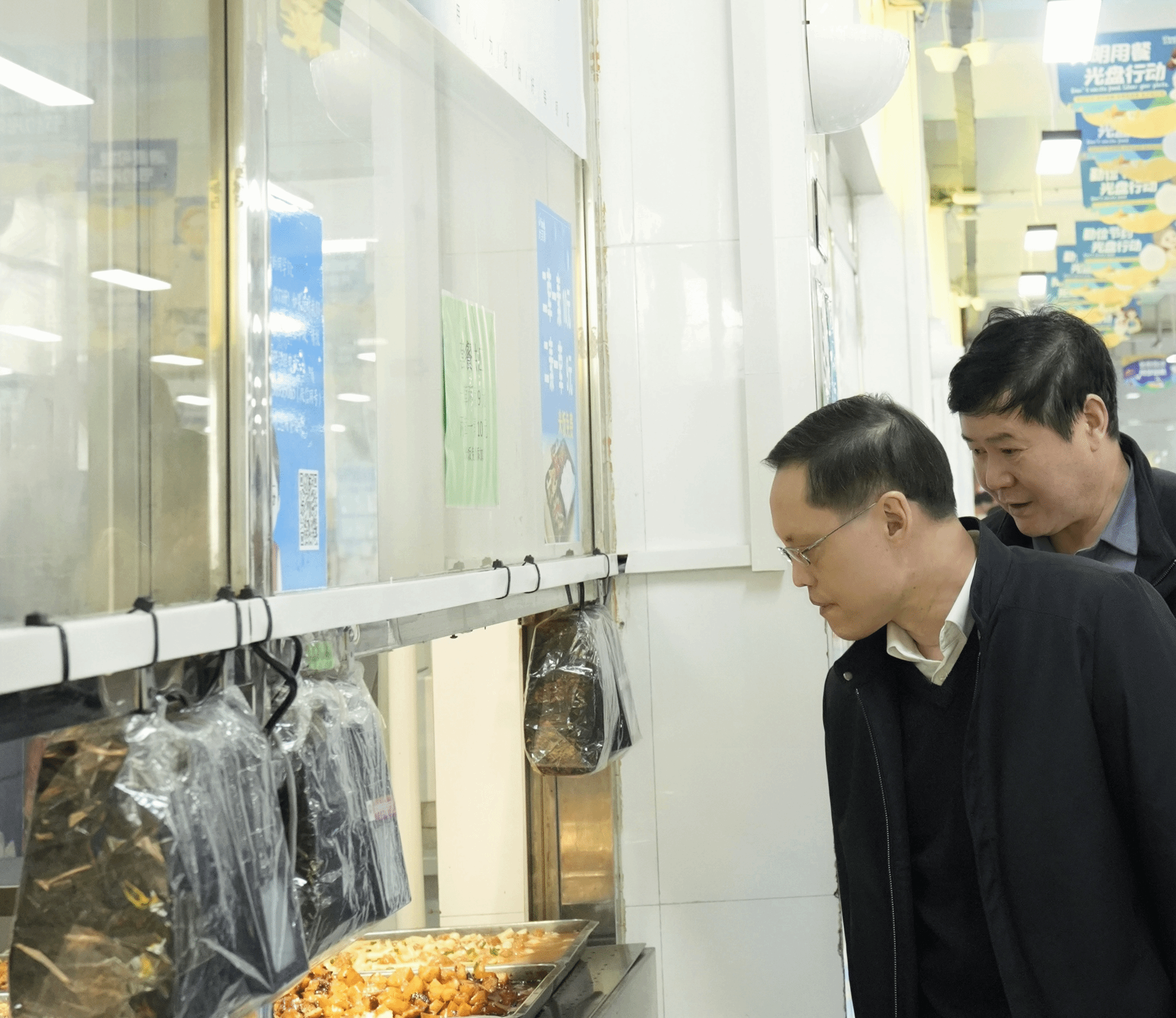 耿鹏(左)深入学校食堂督查