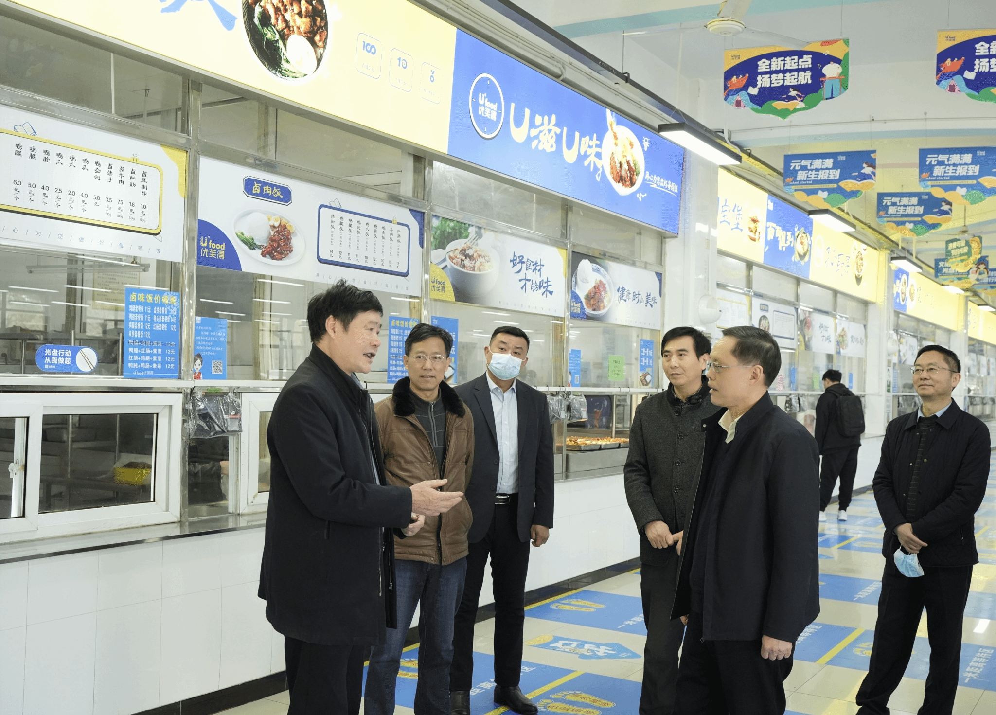余嗣元(左)向耿鹏一行介绍学校食堂情况