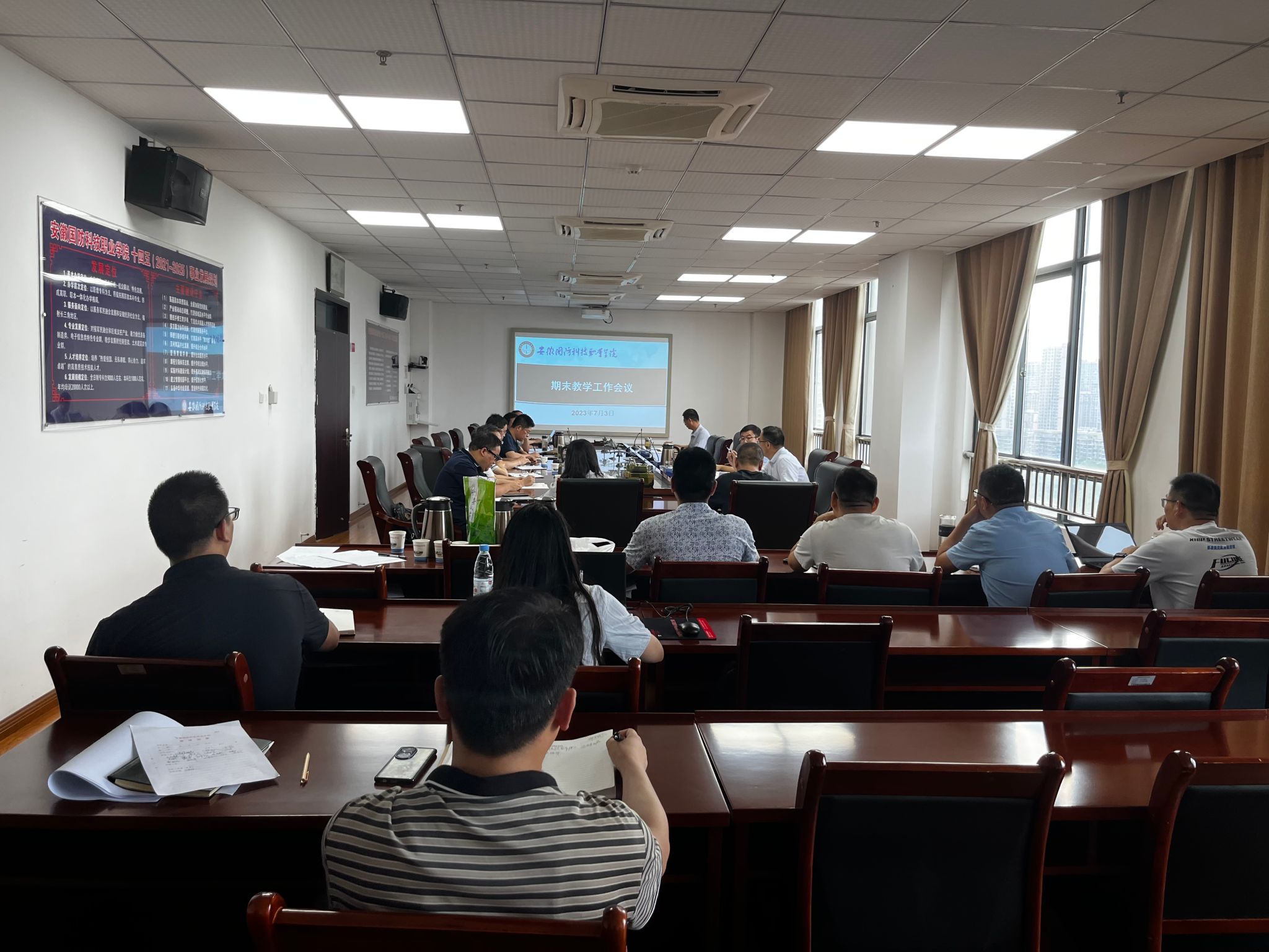 党委委员、人事处处长付贤政布置学校编制周转池制度工作和达办学条件标工程教师材料准备工作。教务处副处长韩玉龙领学《职业教育产教融合赋能提升行动实施方案(2023—2025年)》并对人才培养方案系统功能等进行介绍。党委委员、教务处处长朱修传从各类竞赛备赛保障、人才培养方案制定、调查研究工作、教学安全等方面部署期末工作。继续教育学院院长李中永对函授期末教学工作进行布置。质管办副主任侯国栋对教学督导工作进行布置。