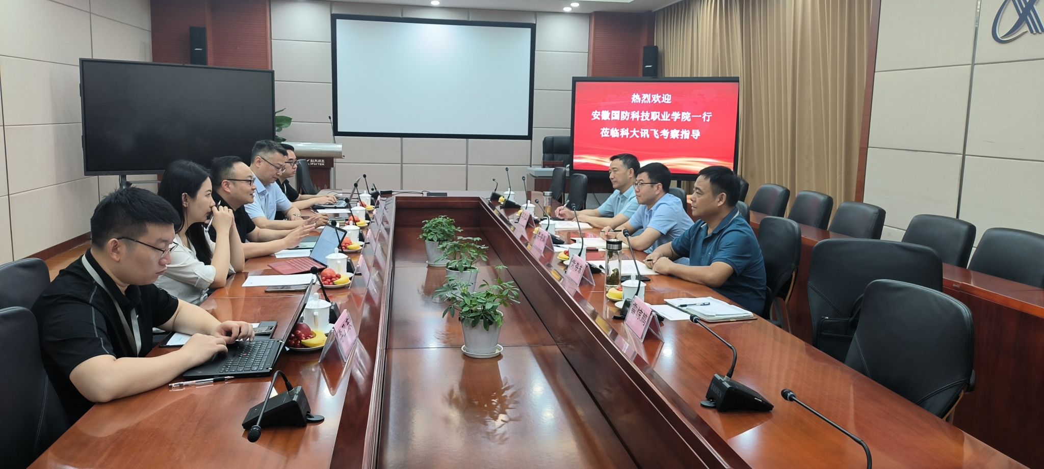 本网讯(信息技术学院 雷惊鹏)为进一步加强校企双方在人才培养、产教融合、师资建设等方面的合作,7月3日,校党委委员、副校长李存鹏率队赴合肥科大讯飞走访调研。校党委委员、工会主席黄存东、网络信息中心主任王志宏、信息学院副院长雷惊鹏陪同调研。科大讯飞高教业务总监胡江院、高教业务总经理李伟国、高教业务市场总监程含含及大模型创新应用、智慧教育等部门相关同志参加交流。