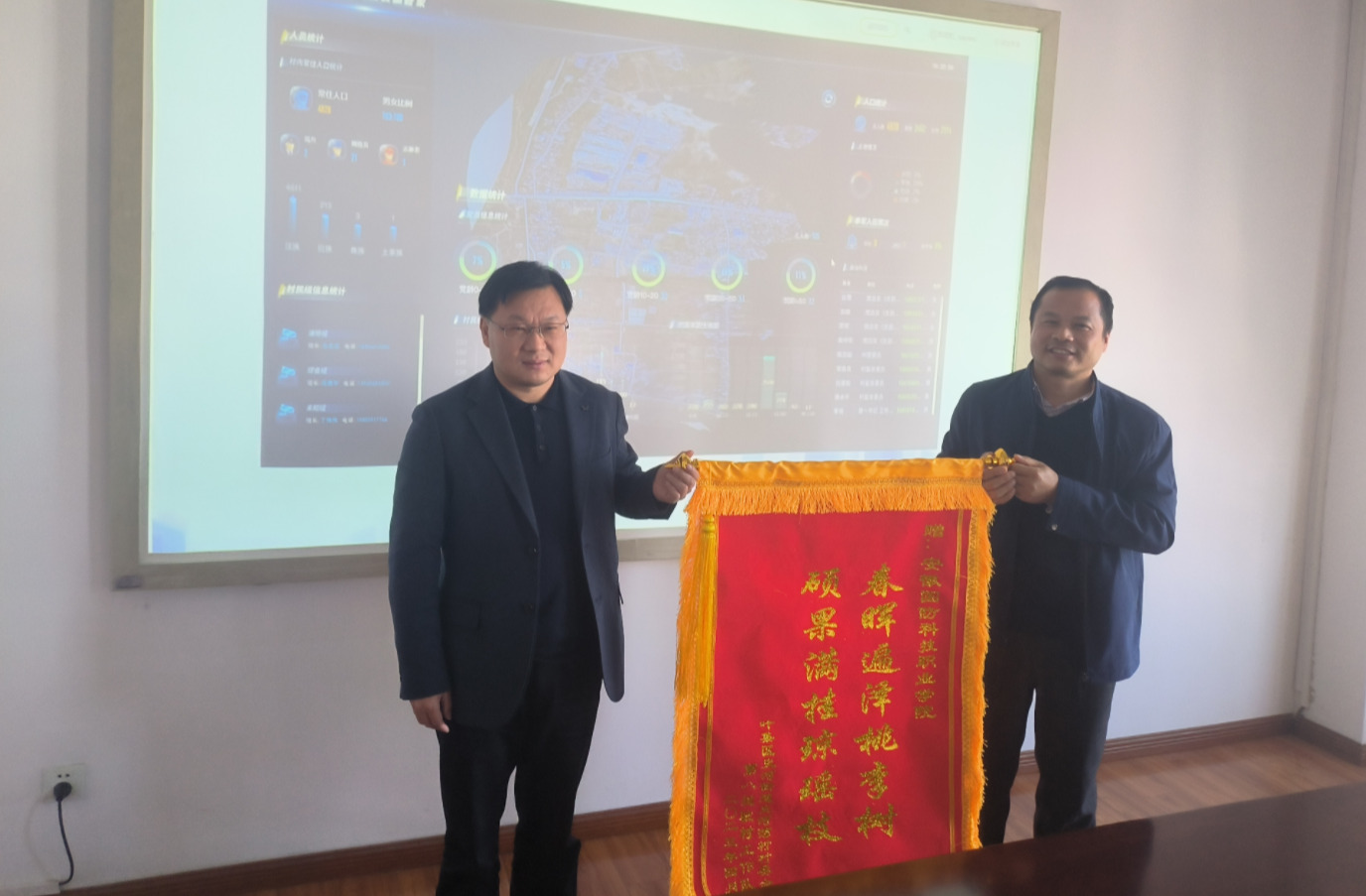 本网讯(信息技术学院 谢宇) 11月24日上午,六安市叶集区史河湾村驻村第一书记李锐一行来学校考察交流,向beat365信息技术学院科研团队助力当地数字乡村建设表达了感谢之情,并向学校和信息技术学院分别赠送了锦旗。校党委书记余嗣元、校长徐正红、信息技术学院院长沙有闯及项目组成员参加交流会。