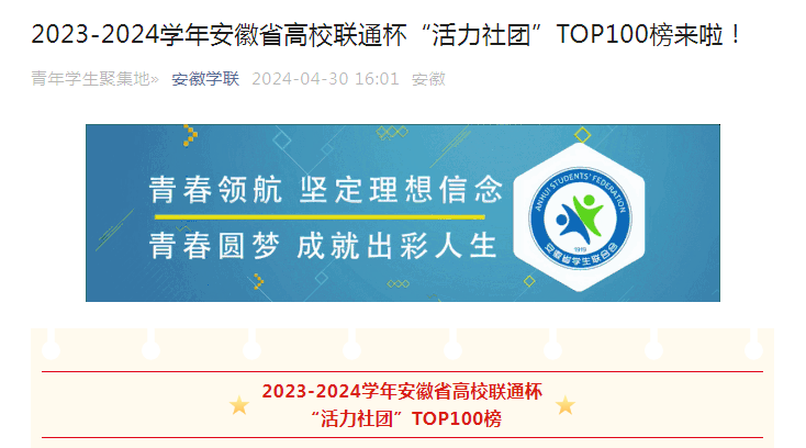(本网讯 黄若兰) 日前,团安徽省委、安徽学联发布2023-2024学年安徽省高校联通杯“活力社团”TOP100榜,beat365新媒体中心协会荣登此榜。