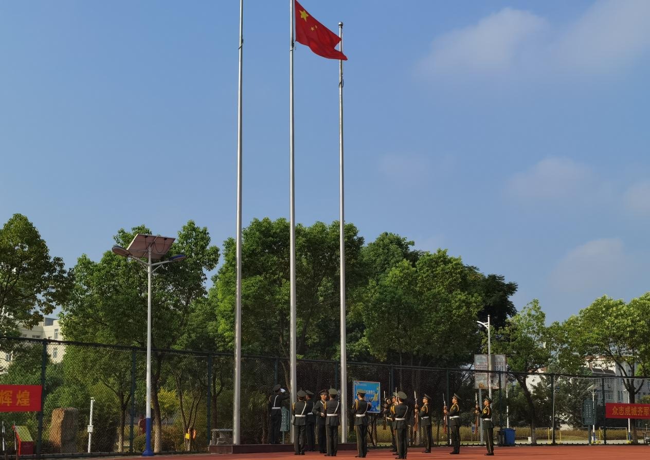 大会伊始,国旗护卫队的同学们踏着铿锵有力的步伐,护送五星红旗入场。在庄严的国歌声中,开学典礼拉开了序幕。全体师生行注目礼,齐声高唱国歌,鲜艳的五星红旗冉冉升起、迎风飘扬。
