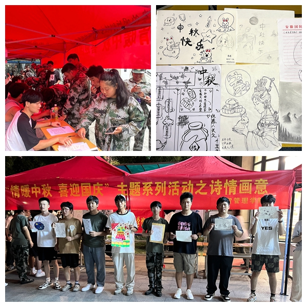 诗情画意迎中秋。系列活动共包含“情暖中秋”“喜迎国庆”两个篇章。9月13日下午,为弘扬中秋传统文化,树立对中华优秀传统文化的认同感和自豪感,经贸管理学院团总支在校食堂门口广场组织开展了第一篇章“情暖中秋”首个主题活动——中秋节诗情画意活动,同学们通过现场朗读背诵中秋节主题诗词或现场绘制展示中秋主题画作的方式积极参与到活动中,既考查了同学们对优秀中华民族传统诗词文化的掌握情况,也充分锻炼和展示了同学们的绘画和艺术创作能力,营造出浓郁的节日氛围。