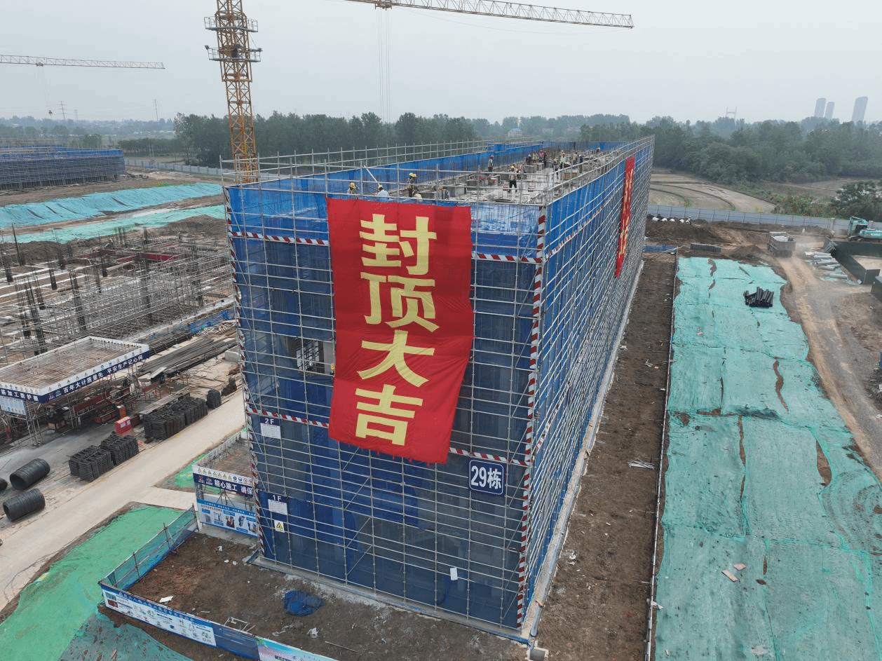 一枝独秀,封顶大吉。松林淠水,土润苔青,新校区如雨后春笋,向阳向上拔节生长。进度最快的建筑单体于2025年5月28日顺利封顶,即将开始内部简装。图为29号楼率先封顶。