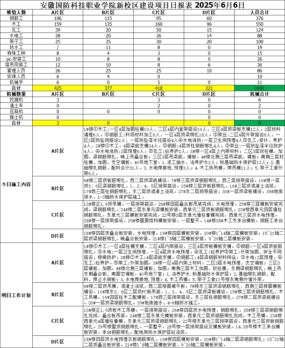 抓住今天是对昨天最好的交待、对明天最好的热爱!工作日报就是要牢牢抓住今天,统筹协调好每天千余人的施工作业。每日晚报主要汇报当天各工种人数、现场机械台套数;A、B、C、D各片区主要施工内容以及次日工作计划。图为2025年6月6日日报。