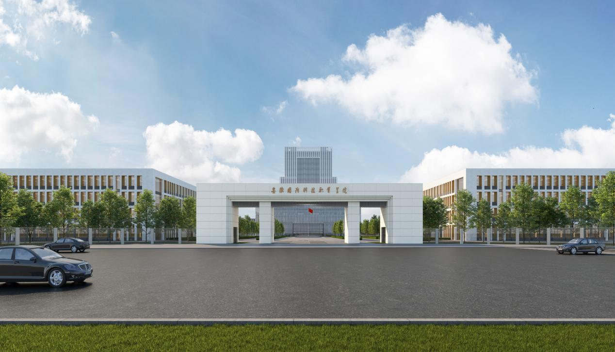 南大门,也是学校礼仪之门,设计棱角分明,典雅庄重,彰显国防气质与稳固。南大门紧邻诗意命名的万佛湖路:朵朵白云下,出南门,抬眼尽览如画美景勃勃新城;滚滚红尘中,辟溪径,举步可浣人间天河悠悠淠水。图为南大门设计效果图。