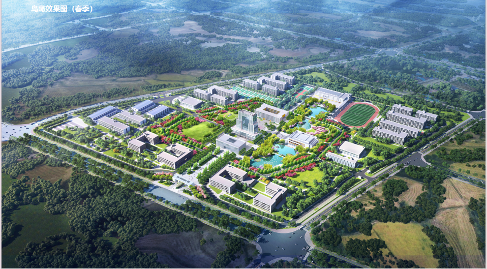 新校区位于六安市东部新城,向南两千米可上六安-合肥快速通道,向北大约3公里可到六安高铁北站,向东经沪陕高速大约40分钟可达合肥新桥机场。校园由清华大学建筑设计研究院规划设计。图为新校区春景鸟瞰效果图。