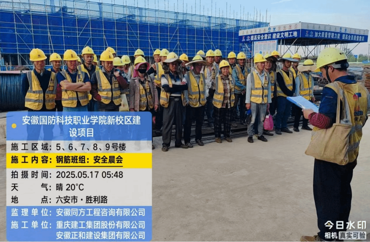 新校区建设管理实行“日、周、月”调度制度。“日”指施工单位每天安全晨会和工作晚报制度;“周”指监理单位每周牵头召开的监理例会制度;“月”指建设单位牵头召开的月度安全工作例会制度。图为2025年5月17日部分区域钢筋班组安全晨会。一张张朴实无华的乐观笑脸,日复一日起早贪黑的劳作艰辛,令人肃然起敬!守住他们的安全、保障他们的待遇,是对他们和他们家庭最好的关爱与尊重!
