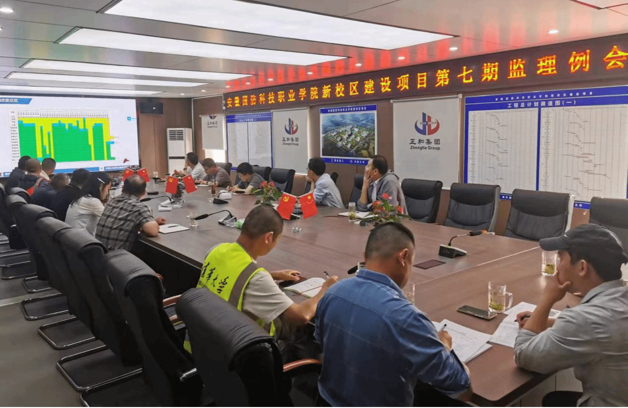 每周监理例会由监理单位牵头召开,各责任主体参会,主要围绕“安全生产、质量监管、形象进度、问题会诊”等进行研究会商,时间跨度三周,即上周例会提出问题解决、本周工作完成以及下周计划情况。图为2025年5月2日“五一”假期召开的第七次监理例会。