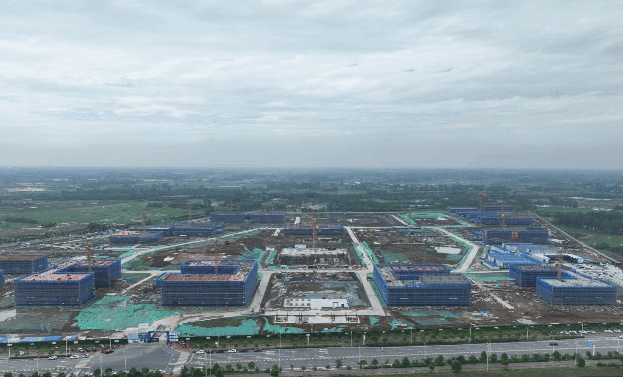 春风吹,夏鼓擂,新家雏形现。目前,新校区40个建筑单体中的39个已开工建设。如火如荼的建设现场:塔吊林立,叼金衔玉,繁忙有序;工匠日千,挥汗如雨,只争朝夕。按照计划,6层及以下的学生公寓、教学实训楼、公共教学楼、食堂等单体将于2025年7月前后陆续封顶,一张宏伟蓝图正在变成美好家园。图为2025年6月9日新校区全景航拍图。