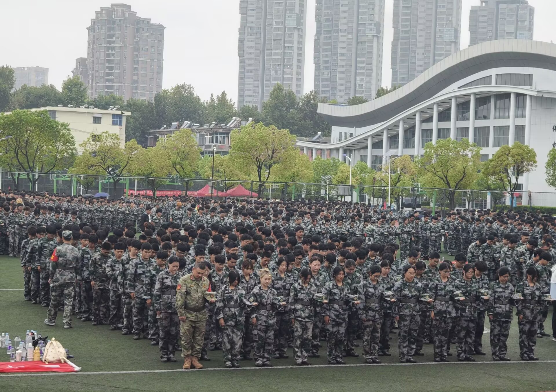 新生们陆续抵达操场后,各连队在教官指挥下快速整队。教官们逐一清点人数,确保全员安全集结并第一时间向演练指挥部报告情况。此外,演练还设置防空袭隐蔽科目,进一步深化了对防空知识与应急技能的掌握。