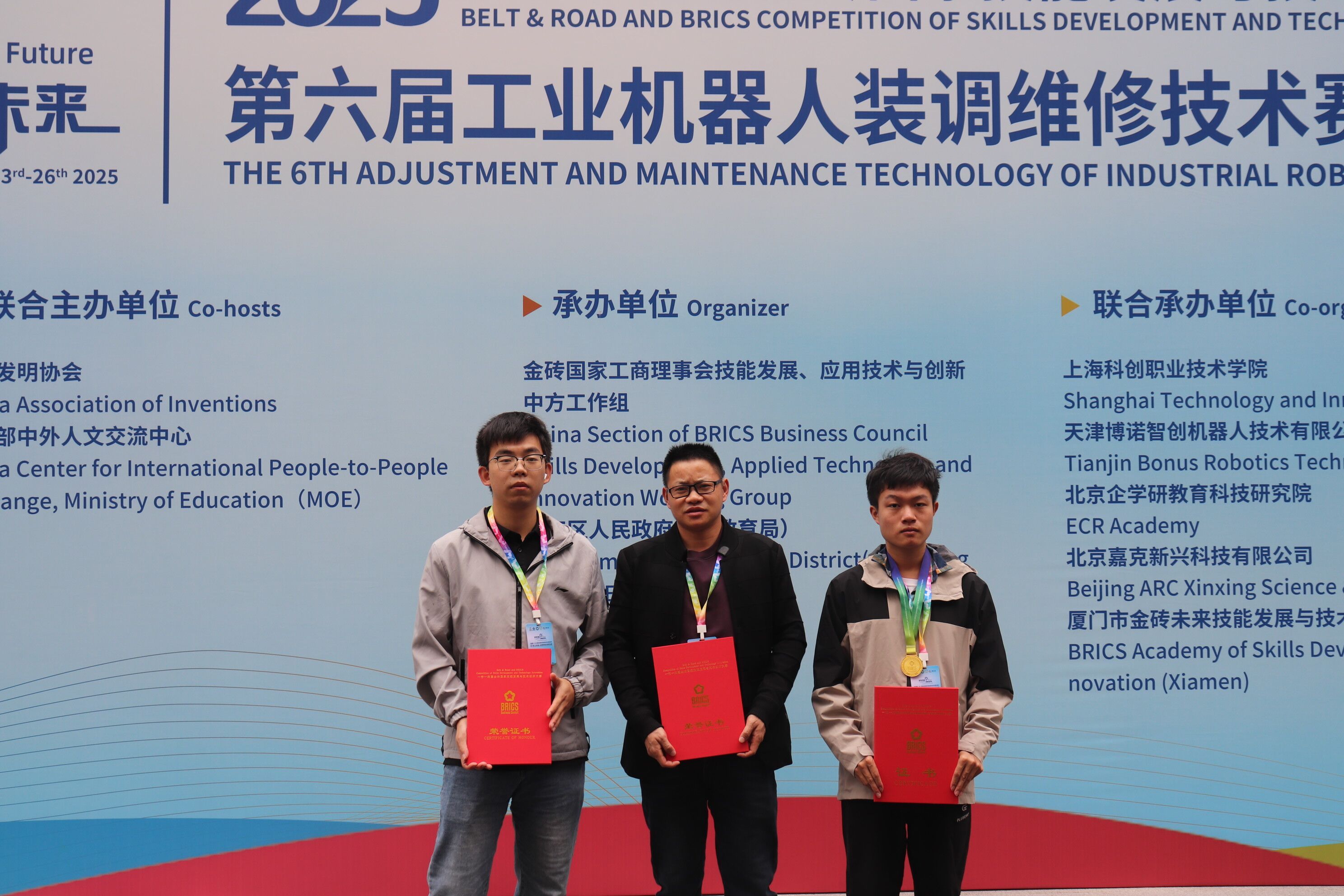本网讯(电气技术学院 吴年祥)10月23日至26日,由金砖国家技能发展与技术创新大赛组委会、“一带一路”暨金砖国家技能发展国际联盟、中国发明协会、教育部中外人文交流中心等单位组织的2025年“一带一路”暨金砖国家技能发展与技术创新大赛第六届工业机器人装调维修技术赛项决赛在上海科创职业技术学院举办。beat365安徽省吴年祥技能大师工作室成员指导的电气技术学院2名选手,从参赛的152名选手中脱颖而出,陆瑞获一等奖、宋泽获优胜奖,学校斩获优秀组织奖。