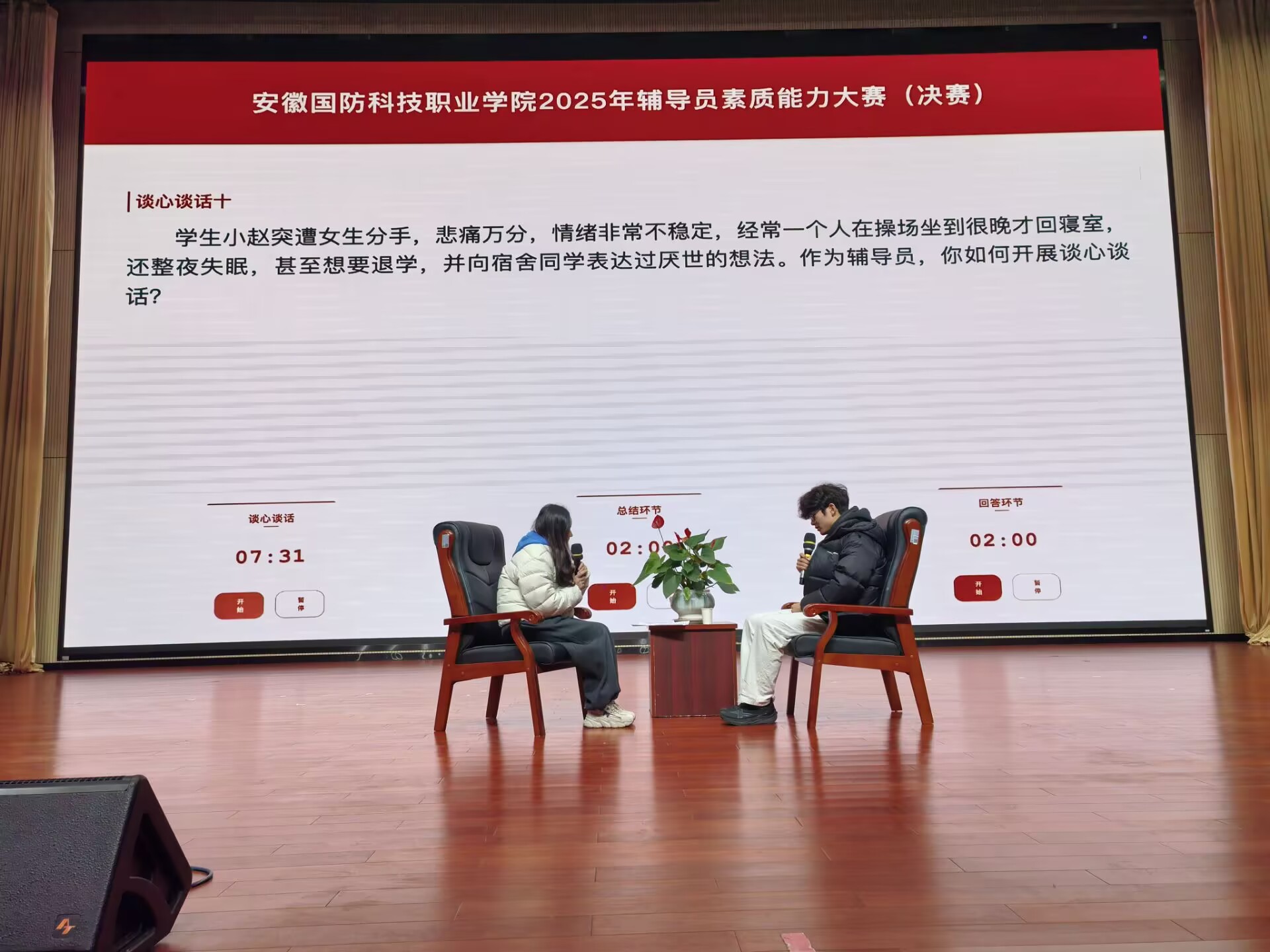 大赛紧密围绕辅导员日常工作实际和职业发展需求,设置了案例研讨和谈心谈话两个环节,主要涉及学生日常教育管理、学业困难、生涯规划、心理困扰、网络舆情、价值引领、矛盾调解、生活关怀等诸多方面,旨在全面、多层次地考察辅导员的综合能力。案例研讨环节主要考察辅导员研判分析问题、解决问题、应急处理能力以及相互学习、协作共进的能力。谈心谈话环节主要考察辅导员对学生成长成才规律的了解把握能力、沟通技巧、共情能力、教育引导能力和解决复杂问题能力。