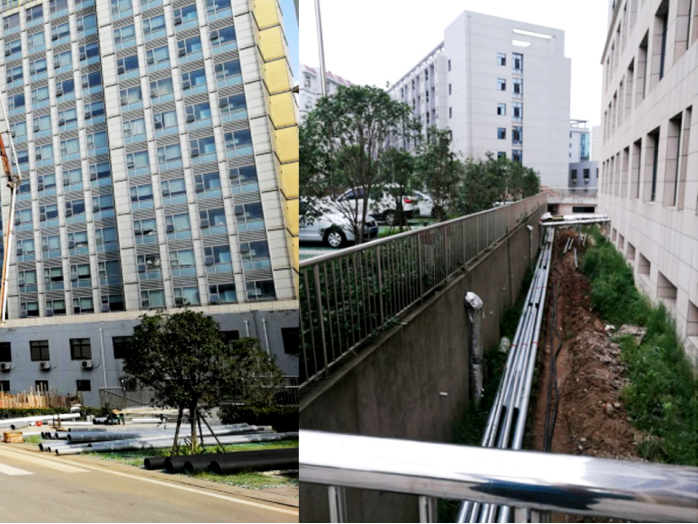 管网改造,是地地道道的默默无闻工程,因为他们不接地气就失去了存在价值!枝枝杈杈的水管气管,纵横交错的电缆光缆,就像一条条保障学校朝气蓬勃、生生不息的血管气管和神经脉络。哪一条都至关重要!上图左为亟待“接地气”的各式管材,右为正在铺设的经过综合楼前地下的大批管网。