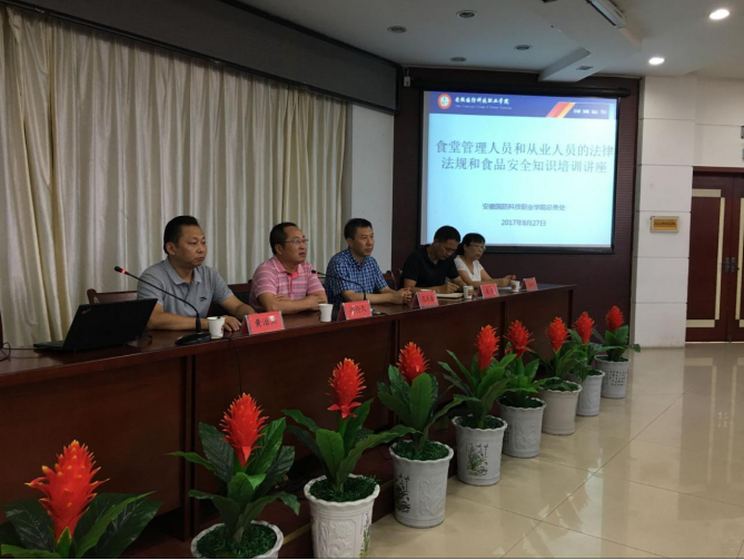 谁知盘中餐,粒粒皆辛苦!哪一盘香喷喷的饭肴不凝结着众多劳动者的聪明智慧、起早摸黑和无数辛劳!为了不断提高学校食堂工作人员的综合素质和业务水平,学校或定期邀请膳食专家来校培训,或定期组织开展业务技能大比拼等活动。上图是8月27日,邀请六安市食品药品监督管理局的范庆金科长(中)、金安区市场监督局的黄治洪队长(左一)来校开展培训。学校党委委员、副校长冯伦久(左二)主持培训会,总务处副处长吴伟(右二)、卫生科科长雷春荣(右一)参加了培训会。