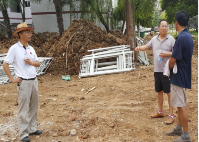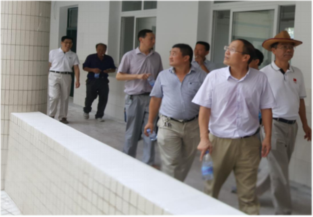 2017年可谓是学校建筑设施的改造升级年。从道路到楼宇,从管网到办公家具,改造升级数量大,质量要求高。因此,从改造方案设计到招标、建设,从过程监管到实地验收,可以说整个后勤系统磨破了嘴,跑细了腿,绞尽了脑汁,但无怨无悔!为了保质保量和按时完成改造升级任务,一顶遮阳帽、一瓶矿泉水几乎成了后勤人的标配。上图为8月16日下午,校长李麟书(左一),党委委员、副校长冯伦久(右二)冒着难耐酷暑深入学生宿舍及周边环境改造现场,指导维修改造工程。