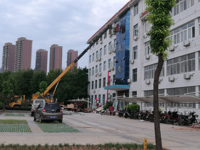 为了改善广大教职工的办公环境,学校利用暑假对行政楼从内到外进行全方位的改造升级。上图为为了采光和美观,租用吊车对即将改造完工的行政楼玻璃幕墙进行清洗。