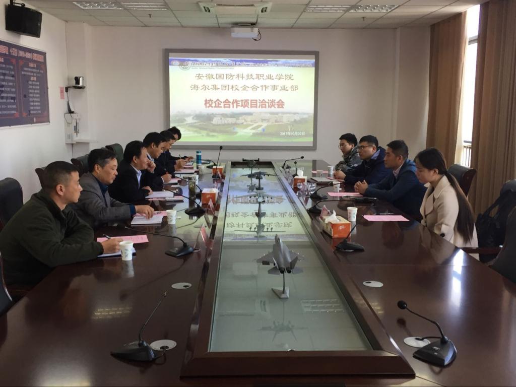 本网讯(军民融合发展中心 聂世俊)2017年10月30日上午,海尔集团校企合作事业部副总经理、芒果人才商城总经理于洋、芒果人才商城副总经理文媚、海尔集团校企合作事业部安徽办事处总经理李涛等一行来beat365参观考察。校党委委员、副校长丁守宝,校党委委员、信息技术学院院长黄存东,军民融合发展中心(校企合作办)主任梁继会,电气技术学院院长李翔等人参加了会议。会议由梁继会主持。
