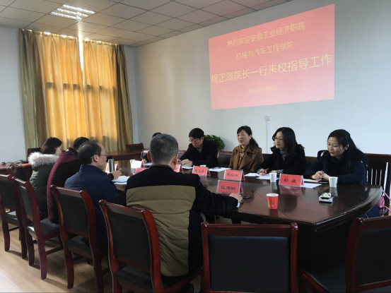本网讯(机械技术学院 项华)3月9日上午,安徽工业经济职业学院机械与汽车工程学院程正翠院长一行5人来beat365机械技术学院考察交流。交流座谈会在学院行政楼120会议室召开。机械技术学院院长黄祥、副院长郭利、办公室主任项华、实训教研室主任江海昕及实训室管理人员参加了交流座谈。