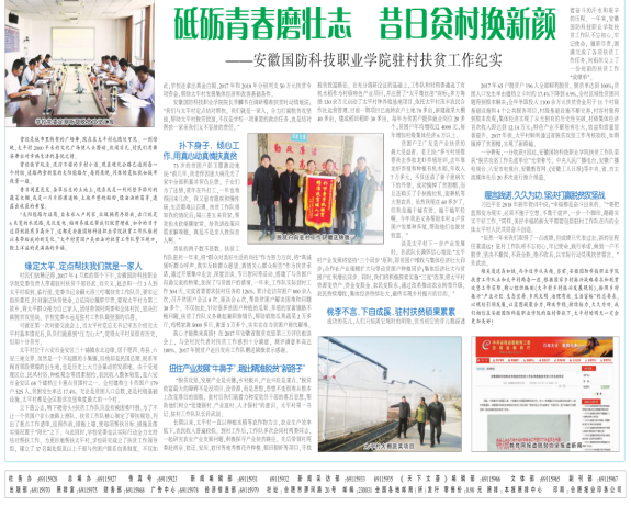 2018年4月29日,《安徽工人日报》以《砥砺青春磨壮志 昔日贫村换新颜》为题,专题报道了学校驻村扶贫工作情况,全面展示了学校驻村扶贫一周年工作成果。