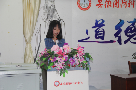 第五环节,伴随着优美的钢琴曲《雨的印记》,电气技术学院党总支副书记罗威带领大家诵读了道德经典《公民道德歌》之爱岗敬业篇。浅显易懂的歌词传播出道德的正能量,引导着我们修身律己、净化心灵,自我教育、自我提高。