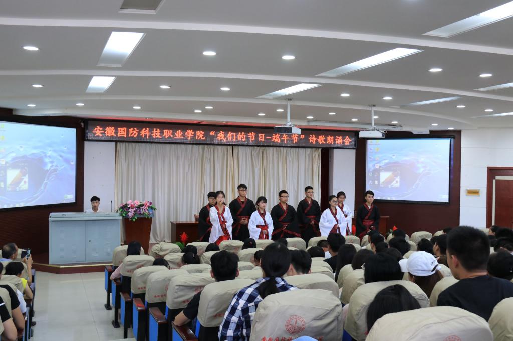 讲座结束后,数名同学呈上了精彩的诗歌朗诵。老舍的《七律 端午》、苏轼的《浣溪沙》、欧阳修的《渔家傲》,一首首荡气回肠的诗歌,仿佛带大家穿越了时光隧道,看到了中国的诗祖屈原,他衣袂飘飘,深情款款,吟诵着精诚所至的爱国情怀。“路漫漫其修远兮,吾将上下而求索”,伴随着哀而不伤的古韵音乐,同学们的诵读时而激情澎湃,时而浅吟低诵,生动展示了端午的由来以及屈原的爱国事迹,现场老师和学生们默默诵读,跟随表演者一起回眸历史,感悟传统。