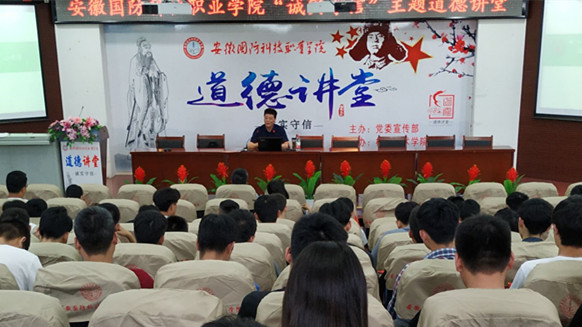本网讯(机械技术学院 袁帅)为深入贯彻党的十九大精神,积极弘扬社会主义核心价值观,全面加强师生思想道德建设,大力弘扬中华民族优秀传统,6月20日下午,由校党委宣传部主办、机械技术学院承办的以“诚实守信”为主题的道德讲堂活动在校图书馆报告厅隆重举行,活动特邀皖西学院马克思主义学院刘孝友教授作主题讲座。机械技术学院党总支书记张宗江,党总支副书记陈思等领导应邀出席,机械技术学院全体教职工,其它学院教师代表和全校200余名学生参加了此次活动。活动由机械技术学院团总支书记袁帅主持。