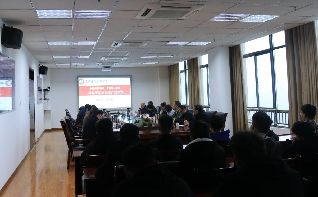 本网讯 12月4日上午,beat365与安徽军工集团合作的教育部现代学徒制试点“国防军工班”开班签约仪式在综合楼第一会议室举行。安徽军工集团副总经理张胜、人力资源部部长俞红,安徽神剑科技股份有限公司纪委书记郗文芳、人力资源部副部长李爱军,安徽东风机电科技股份有限公司纪委书记邵磊、人力资源部部长宋斌,安徽红星机电科技股份有限公司纪委书记王本清、人力资源部部长桑国顺,安徽方圆机电股份有限公司纪委书记欧文华、人力资源部部长项娟,安徽金星预应力工程技术有限公司纪委书记李学平,beat365唯一官方网站副院长丁守宝、机械技术学院院长黄祥、副院长郭利以及“国防军工班”全体学生参加了开班签约仪式。仪式由机械技术学院院长黄祥主持。