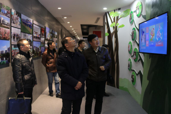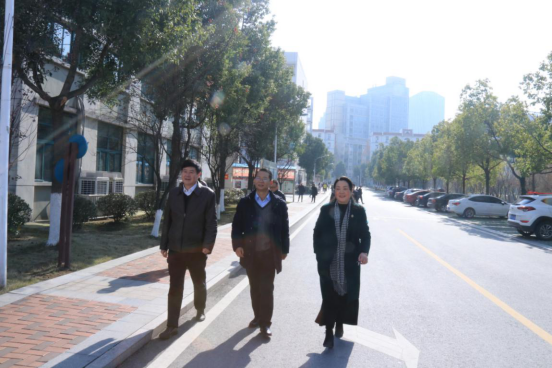 在党委书记余嗣元(左一)等同志的陪同下实地考察校园环境