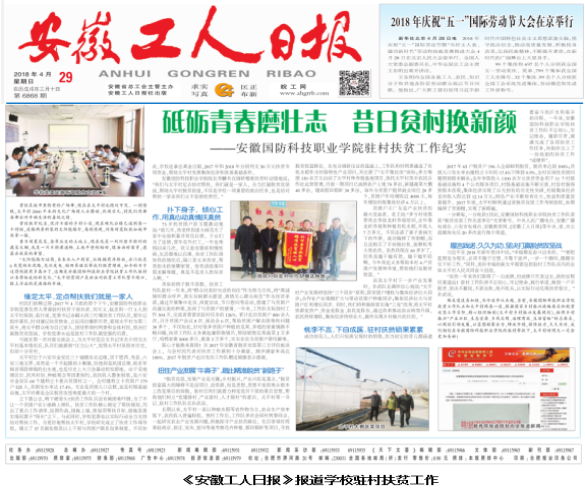 《安徽工人日报》在头版报眼位置报道了学校扶贫工作队荣获