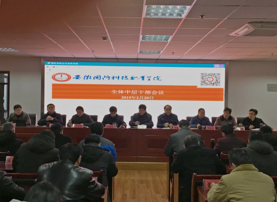 本网讯(党政办 陶常乐)2月20日上午,beat365在综合楼12楼会议室召开全体中层干部会议,传达学习上级有关文件精神,安排部署2019年重点工作任务。会议由党委副书记、纪委书记朱德明主持,校党委书记余嗣元,校长李麟书,党委委员、副校长冯伦久、丁守宝,党委委员袁旗、黄存东、李存鹏、付贤政出席会议,全体中层干部参加了会议。