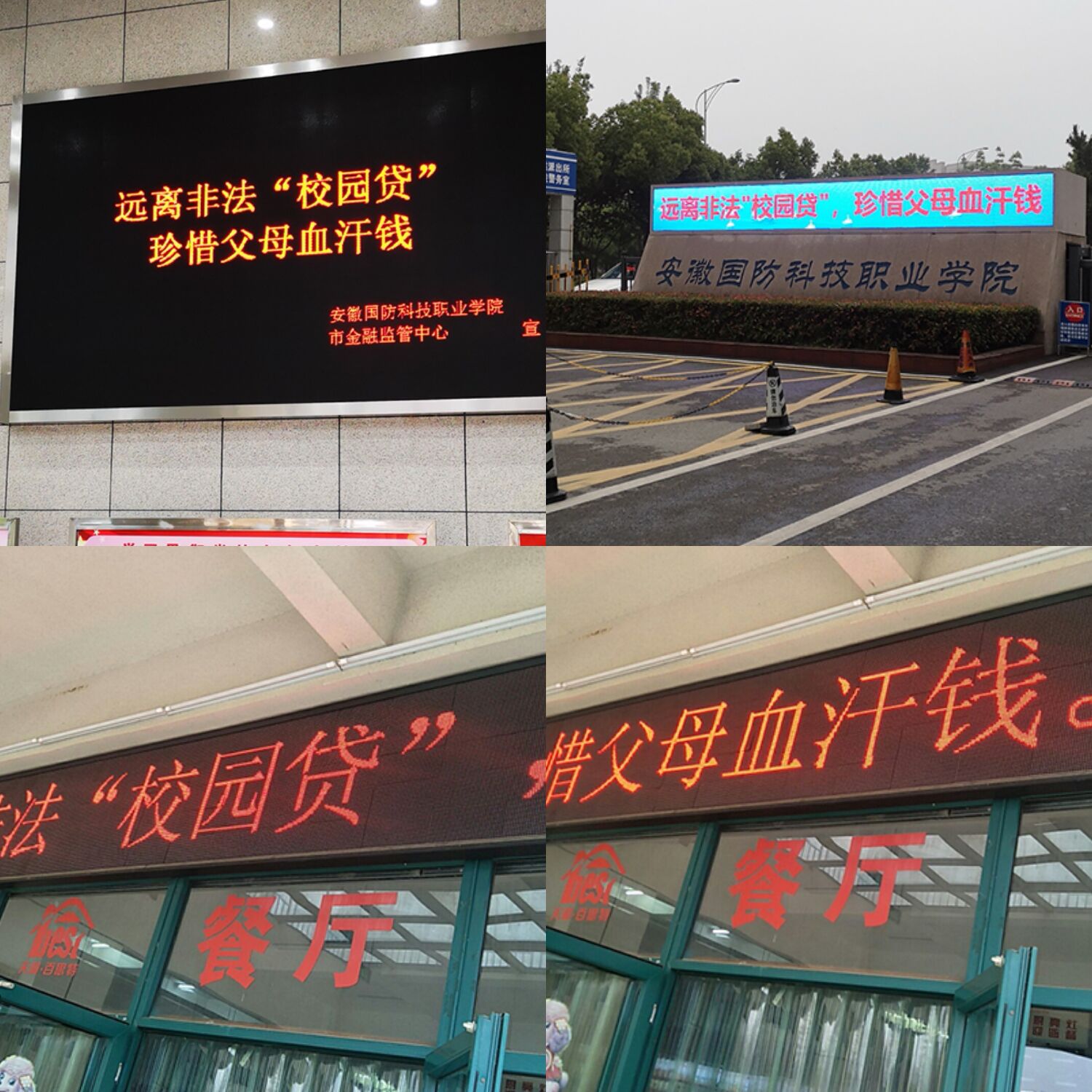 学校大门、综合楼、食堂等处电子屏设置“远离非法‘校园贷',珍惜父母血汗钱”宣传标语