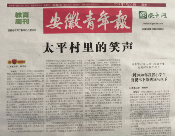 2019年1月30日,《安徽青年报》在教育周刊栏目中以“太平村里的笑声”为题,全面报道了学校结对帮扶太平村以来取得的扶贫工作成效。